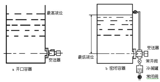 差压式液位变送器安装在最低液位的同一水平高度上。测量开口容器时,仪表负压室通大气。测量密封容器时负压室通容器上部,此时若负压室保持干燥,则可不装冷凝罐,若安装冷凝罐应定期将罐中的冷凝液排出;排液时应将常开阀关闭,以免变送器承受单向压力,见图34。
