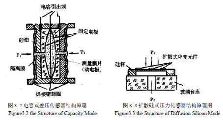 扩散硅式压力传感器见图3.3。丈量敏感元件为周边固支的硅杯,在此杯单晶硅膜片的上下两侧出现压差时膜片内部孕育发生应力。在压力P1、P2 作用下电桥出现不均衡,输出一个正比于压力变革的电压信号。