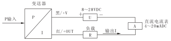 a)、二线制4~20mADC输出电气连接方法如下图所示。