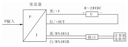 b)、RS485接口型变送器用于RS485通讯时的电气连接方法如下图所示。
