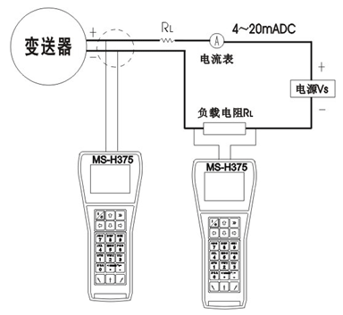 c)、HART协议型变送器与手操器连接的两种接线方式如下图所示。